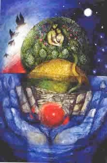 Die Mitte dieses Gartens bilden nun zwei (?) Bäume, der Baum des Lebens und der Baum der Erkenntnis von Gut und Böse. Der Baum des Lebens ist in den verschiedenen Mythen des Orients weit verbreitet. In der Mitte der Welt steht der Baum des Lebens. Diesem ´bekannten´ Baum stellt der biblische Erzähler nun aber einen weiteren Baum an die Seite, den Baum der Erkenntnis.
