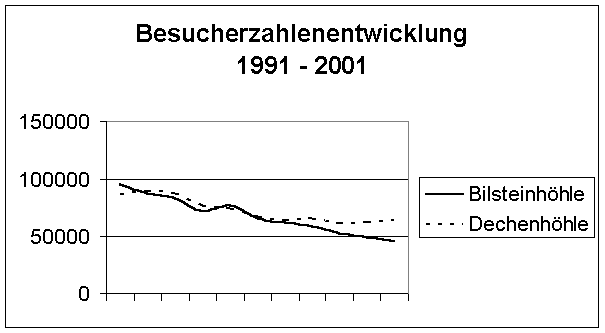 Dargestellt ist hier die Entwicklung der Besucherzahlen in den Jahren 1991 – 2001 an der Bilsteinhöhle im Vergleich zur Entwicklung an der Dechenhöhle. Im Laufe der vergangenen 10 Jahre ist bei beiden Höhlen die Zahl der Besucher zurückgegangen, soviel ist beiden gemeinsam. Es fällt aber auf, daß es der Dechenhöhle in den vergangenen Jahren gelungen ist, zuerst den Abwärtstrend aufzuhalten (etwa seit 1996), zuletzt sogar einen gewisse Trendwende hin zu mehr Besuchern einzuleiten. Im Gegensatz dazu befindet sich die Bilsteinhöhle nach wie vor in einem ´stabilen Abwärtstrend´. Fast 20.000 Besucher trennen die Bilsteinhöhle von der Dechenhöhle. Unterhalb der 40.000-Besucher-Schwelle beginnt für Schauhöhlen langsam der Bereich der Bedeutungslosigkeit.