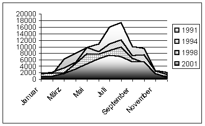 Eine zweite Graphik macht die Situation noch einmal deutlich. Dargestellt ist hier der ´Jahresgang´, die monatlichen Besucherzahlen an der Bilsteinhöhle in vier unterschiedlichen Jahren. Es fällt auf, daß in allen Bereichen kräftige Rückgänge zu verzeichnen sind, es insgesamt zu einer ´Verflachung´ gekommen ist, also die kräftige Spitze im Sommer fehlt. An dieser Stelle wäre endlich eine ehrliche und kompetente Situationsanalyse geboten. Schnelle Erklärungen und Lösungsangebote sind hier gründlich verfehlt.